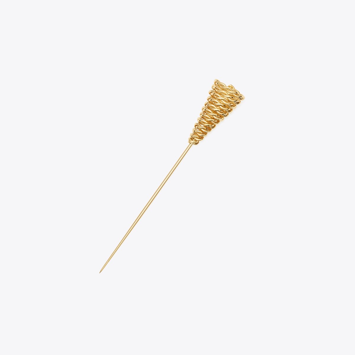 ヴィンテージのブローチをイメージした ランウェイ ハニカム ピン。18KGP(18Kゴールドプレーテッド)ブラスを使用した、オーガニックなひねりの効いた円すい状のアイテムです。トレンド感あふれるアクセサリーがセーターやシャツ、ジャケットに洗練された魅力をプラスします。
