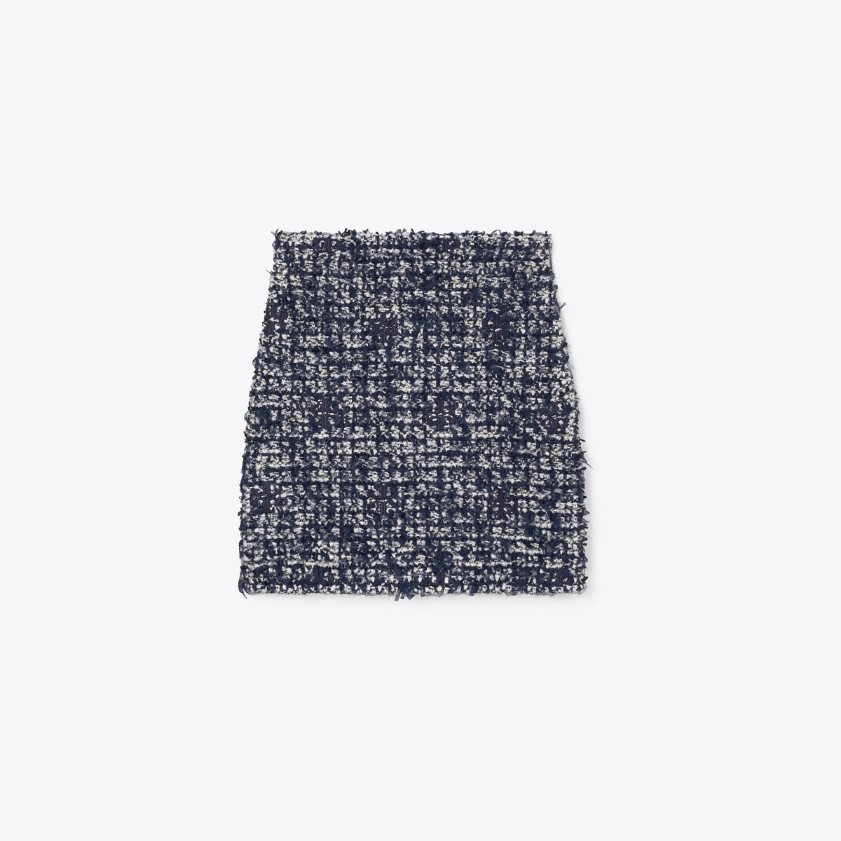 ソフトなニット素材で仕立てた、ミニ丈のケンドラ ツイードスカート。同系色のダブルT刺繍を全体にあしらいました。お揃いのカーディガンと合わせれば、スカートスーツのモダンなセットアップの着こなしが完成します。