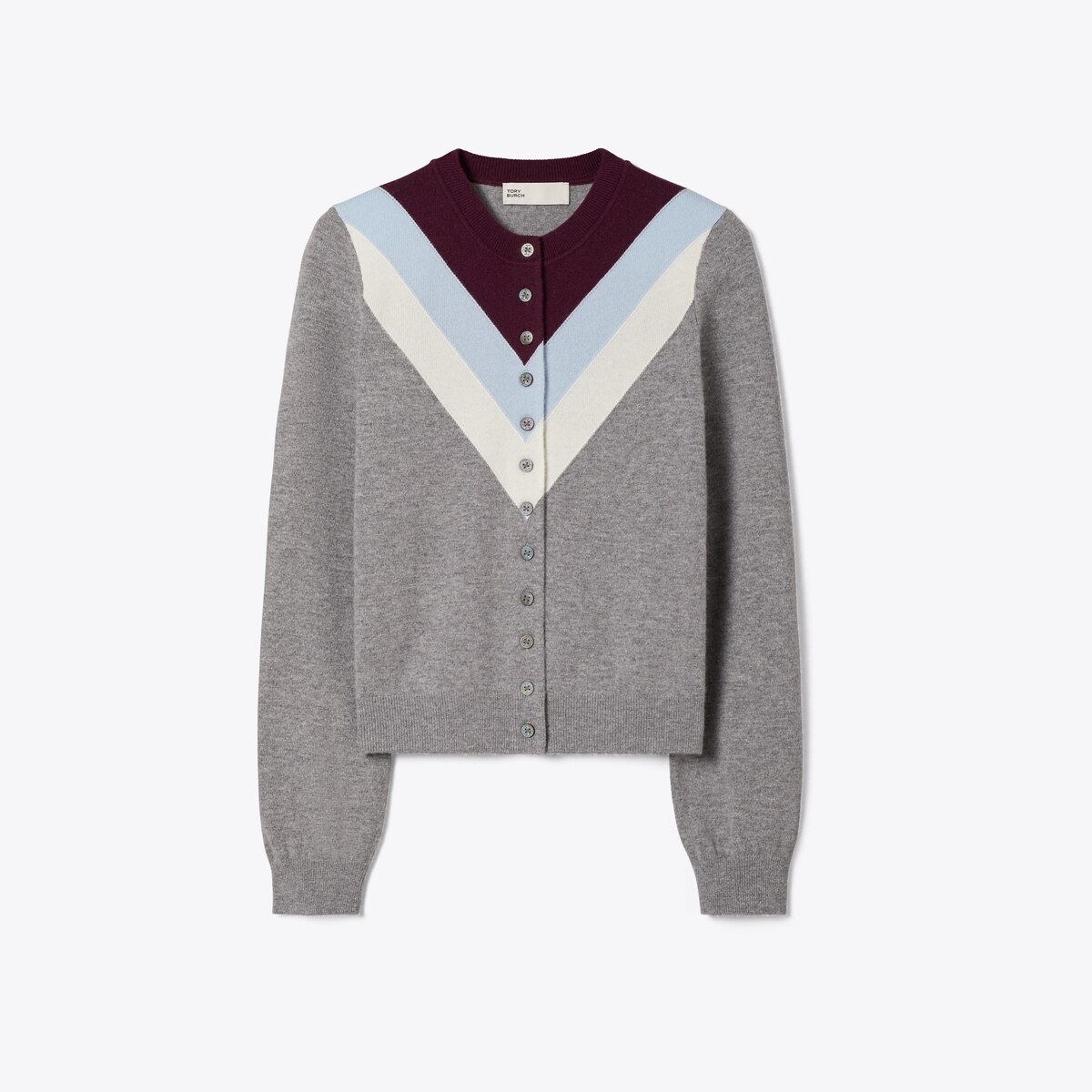 暖かいウールとカシミアの混紡素材を使用した、クラシックなカーディガン。シグネチャーのシェブロン柄が特徴。マザーオブパールのボタンがワンランク上の印象をプラス。