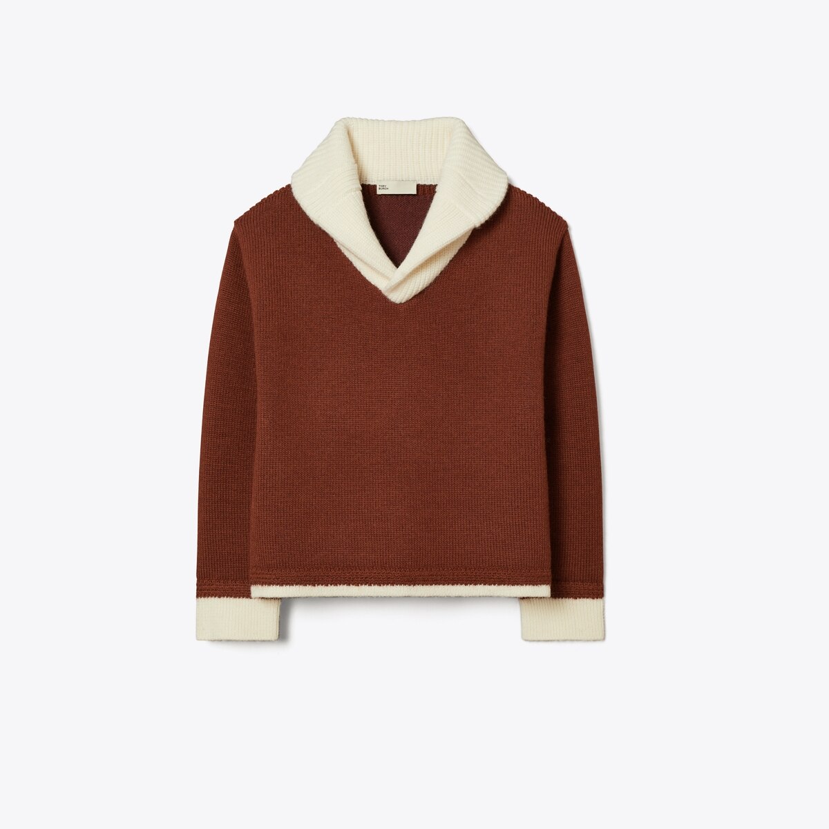 • コントラストを効かせたウールのショールカラー、袖口、裾