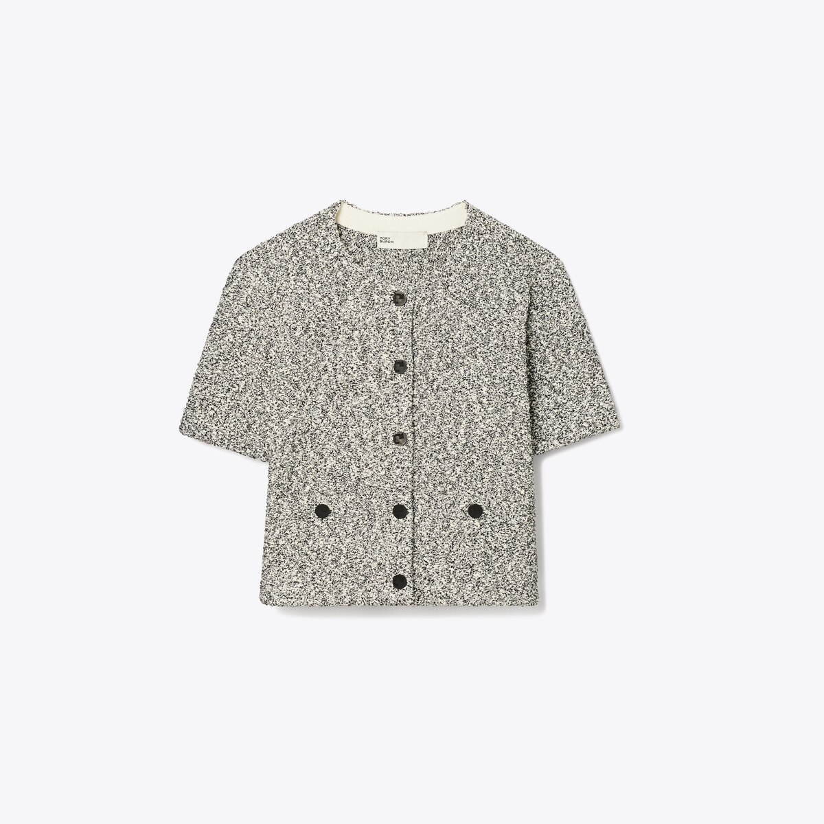 セーターをテーラード風にアレンジ。光沢のあるメタルボタンをあしらった半袖のクロップド ツイード カーディガン。Tシャツやドレスなど何とでも合わせやすく、着回しのきくアイテムです。お揃いのスカートと合わせれば、セットアップとして着こなすことができます。