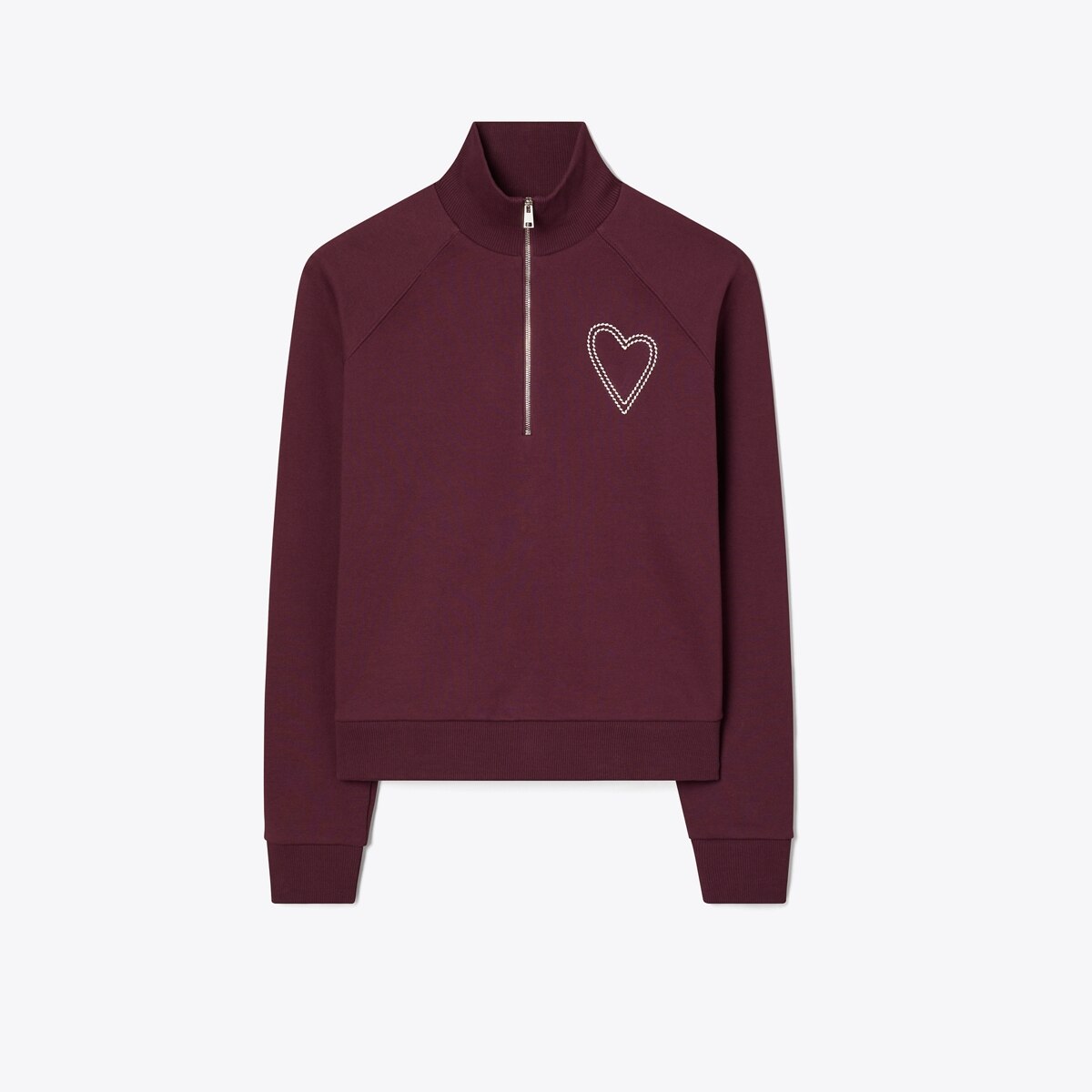 フレンチテリーコットンで仕立てた、とびきり快適なラグランスリーブのクオータージップ スウェットシャツ。左胸にピックステッチのハート刺繍をあしらったデザイン。
