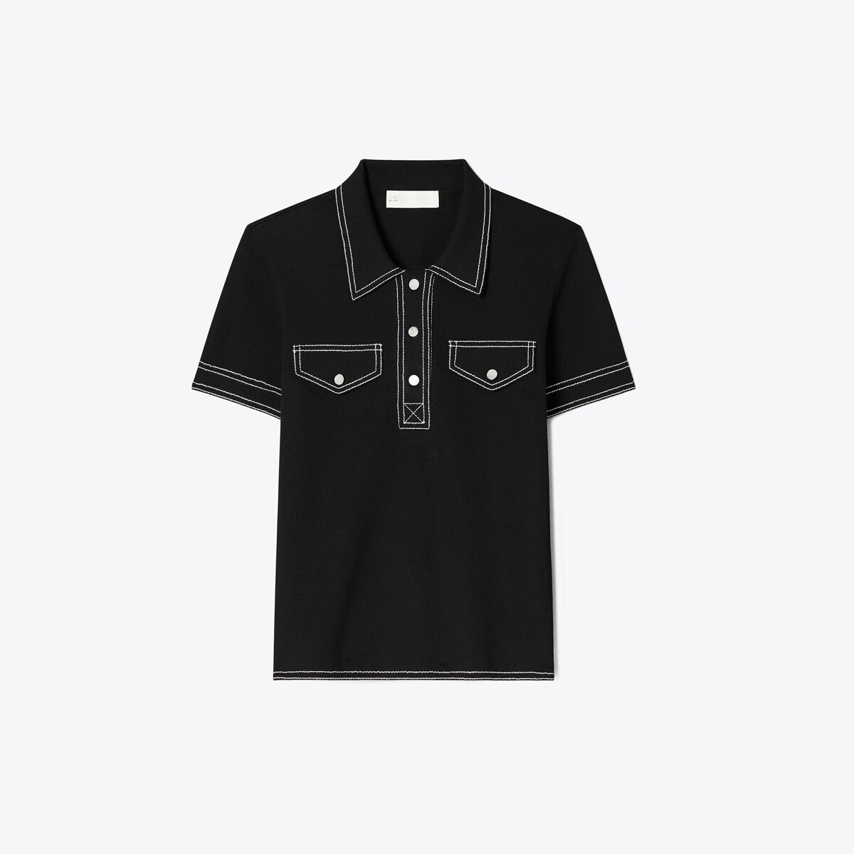 コントラストの効いたトップステッチやパッチポケットなどの実用的なディテールがグラフィックなアクセントを添えるウールポロシャツ。お揃いのスカートと合わせれば、カジュアルでありながら洗練されたコーディネートに。