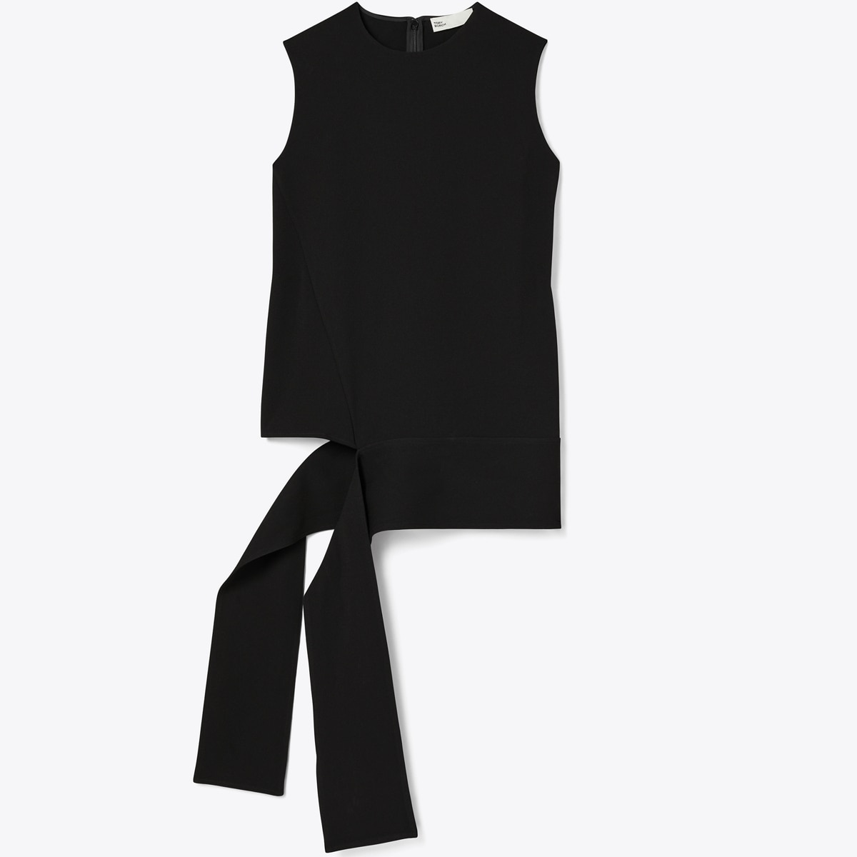 - 背面にかぎホック留め付きのコンシールファスナー、左裾にタイ