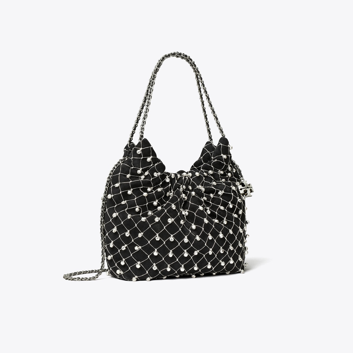 タイムレスな魅力を放つ、フレミング ミニ ホーボーバッグ。卓越したクラフツマンシップとさりげない音の遊びが彩りを添える、ホリデーシーズンのパーティに最適なバッグです。ブレイドチェーンストラップとレザーレースをあしらい、シルバーのネットで覆った、ソフトでルーズなシルエット。小さなメタルベルは手作業で飾りつけられています。