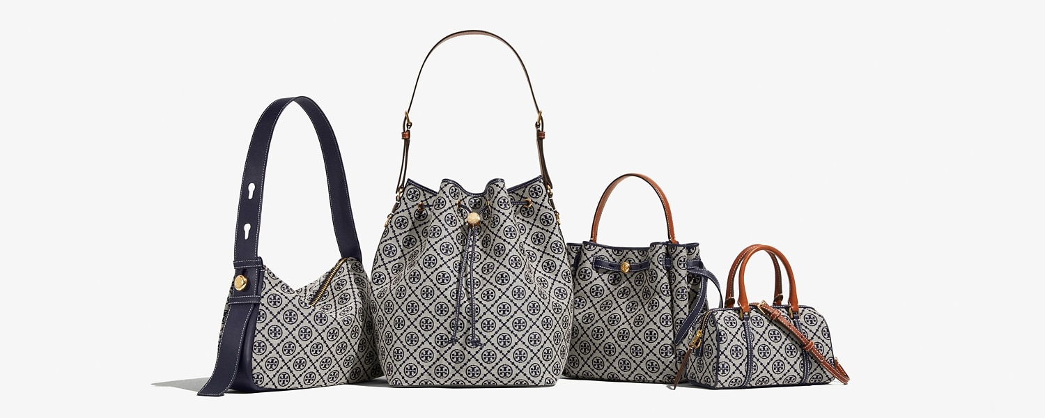 Tモノグラムパターンは、トートバッグ、スモールショルダーバッグ、バケットバッグ、クロスボディストラップ付き、ベルトバッグ、モノグラム財布やカードケースをはじめとする小物など、さまざまな形のバッグにあしらわれています。