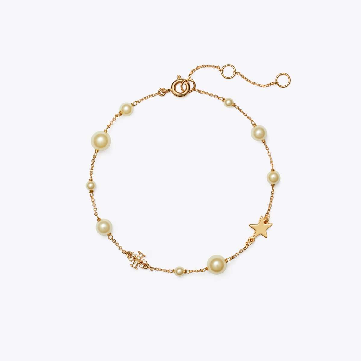 月の光と神秘を映し出す天然パール。世代から世代へと受け継がれていく美しさ。MOONDANCE(ムーンダンス)デリケート パール&スター ブレスレットは、さまざまなサイズのパールとクリスタルをちりばめたダブルTロゴをあしらったデザイン。