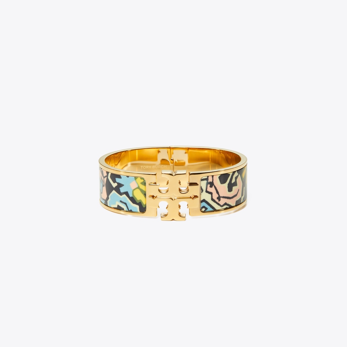アイコニックなダブルTモチーフにインスパイアされたジュエリーコレクション。シンメトリーが描く力強さと美しさ、そしてタイムレスなスタイルの融合。 カラフルなエナメルと面取りカットのダブルTロゴを組み合わせたICON(アイコン)ワイドバングル。 他のブレスレットやウォッチとの重ね着けでも、単体で着用したクラシックなスタイルでも映えます。