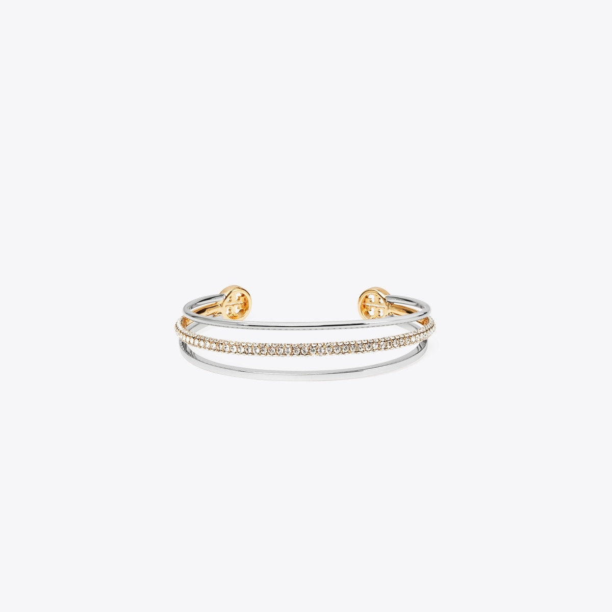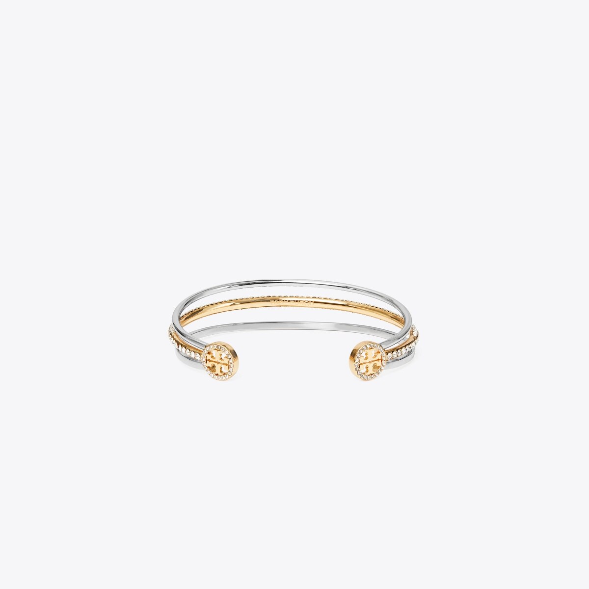 ブランドを象徴するコレクションより登場した、ICON(アイコン)パヴェ カフ。シグネチャーの円形ダブルTロゴをグラフィックなスタッズにアレンジしました。3つのブレスレットをひとつにまとめたようなデザイン。メタルとパヴェクリスタルを組み合わせています。