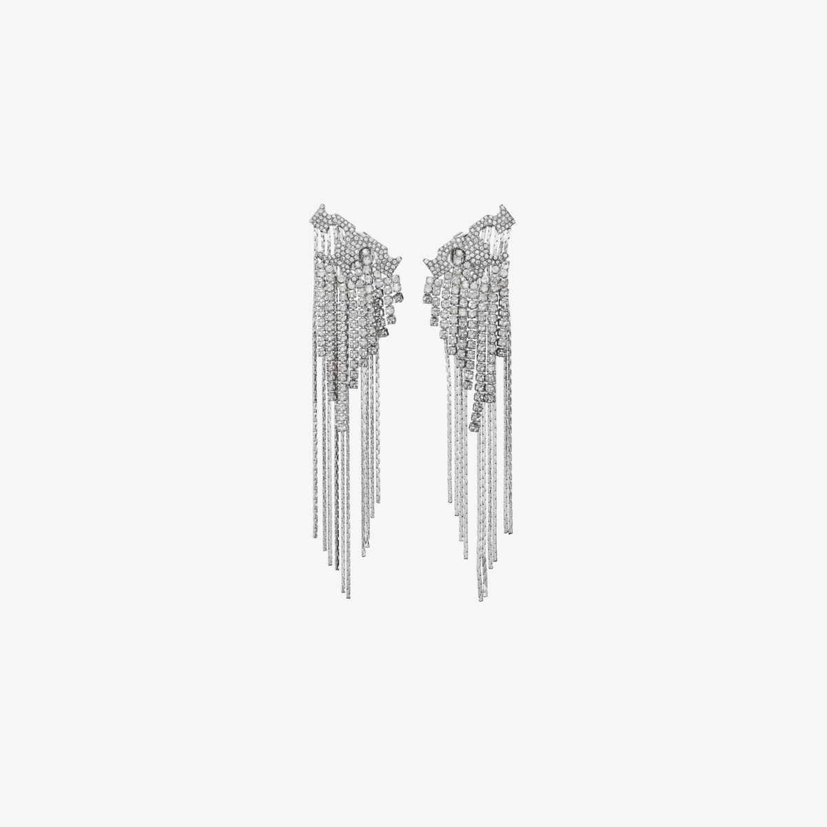 秋のランウェイで登場したアイテムからインスパイアされた、しなやかなヘリンボーンチェーン。1970年代のニューヨークとアールデコの幾何学模様を彷彿とさせるデザインです。クリスタル ロゴ ピアスには、カスケードチェーンに覆われたシングル セリフ Tがあしらわれています。