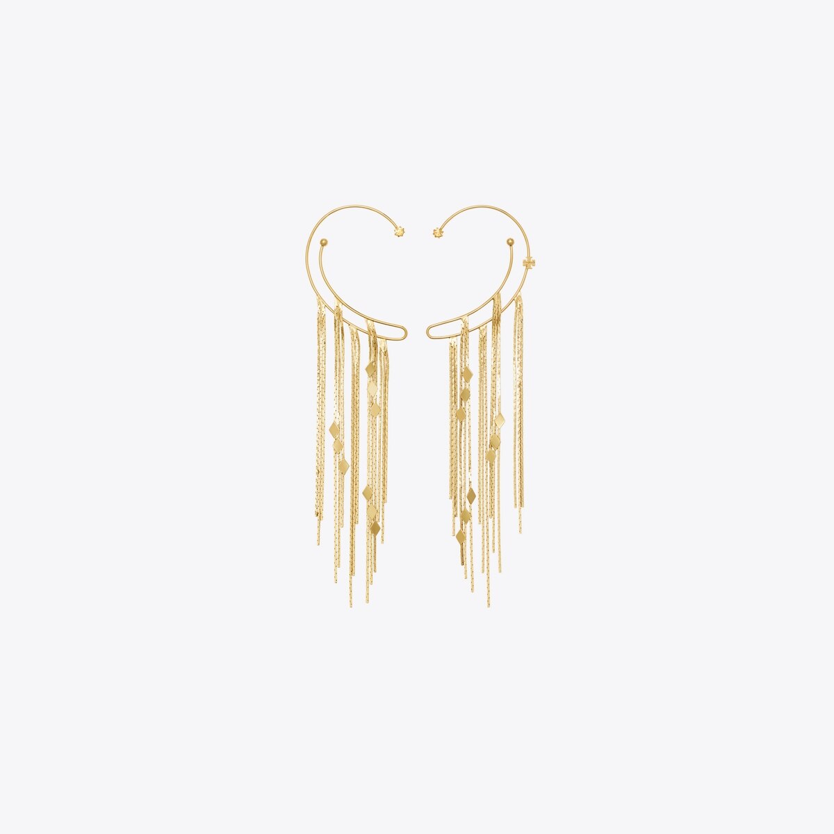 秋のランウェイで登場したアイテムからインスパイアされた、しなやかなヘリンボーンチェーン。1970年代のニューヨークとアールデコの幾何学模様を彷彿とさせるデザインです。耳の上部を包み込むワイヤーがあしらわれたランウェイ チェーン イヤーカフ。3本のチェーンが耳の裏側に揺らめきます。