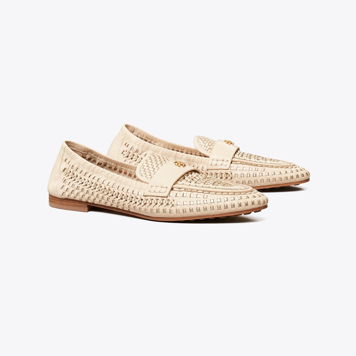 バレエスリッパの柔軟性と、ローファーのシルエット。2つの定番シューズを組み合わせたバレエ ローファー。機能性に優れた快適なインソール、動きやすいサイドのルーシュ、つま先部分に配した滑りにくい靴底が特徴です。ソフトレザーを編み、ブラッシュゴールドのダブルTロゴをあしらいました。コバのペイントと、ストラップを固定するためのステッチを手作業で仕上げています。驚くほど履きやすい、シックな一足です。
